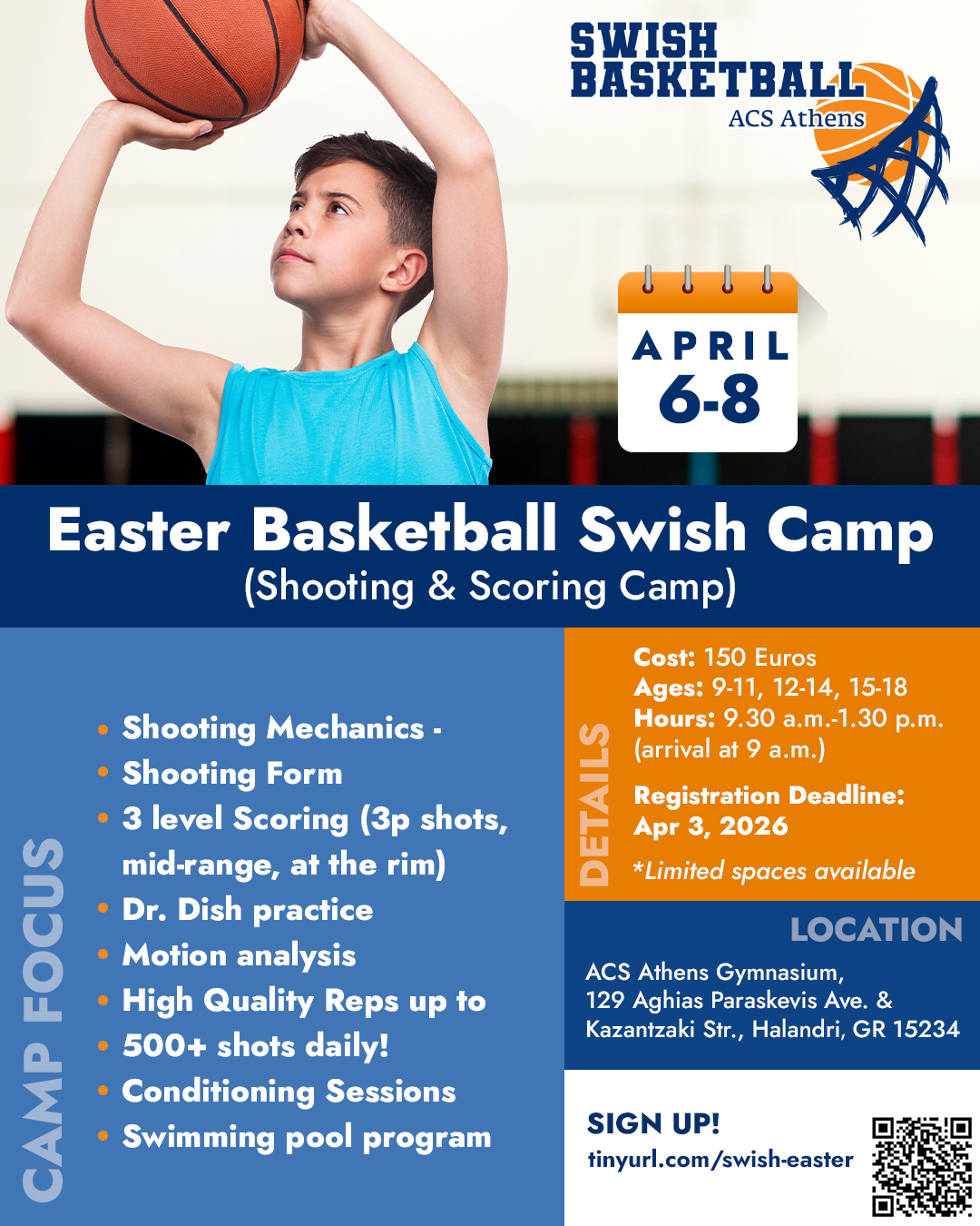 Young basketball players will have the opportunity to elevate their game this spring at the Easter Swish Basketball Camp, taking place April 6–8 at the ACS Athens Gymnasium.