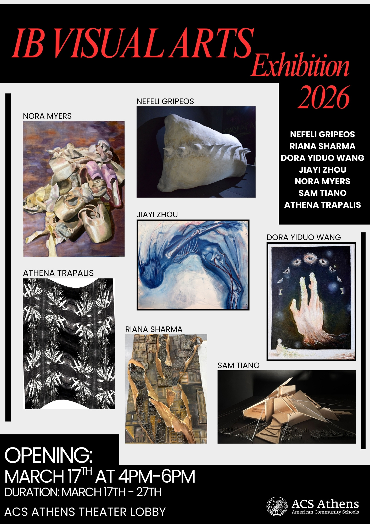 ACS Athens is pleased to invite the community to the IB Visual Arts Exam Exhibition 2026, showcasing the final work of our IB Visual Arts students.