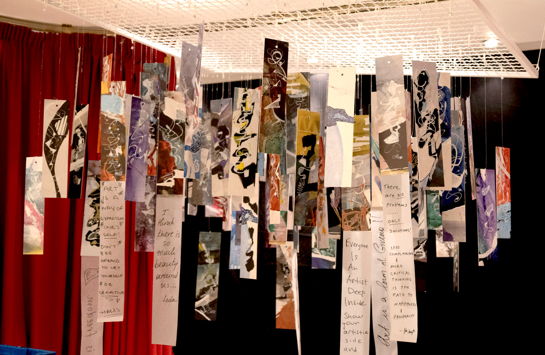 A unique element of the exhibition was the interactive installation Waterfall (2025) by artist and Spotlight curator Leda Tsoukia. The installation invited members of the ACS Athens community to actively take part by sharing a thought, feeling, or moment from the present. Visitors wrote their reflections on transparent sheets of paper and attached them to the hanging installation, gradually shaping the work over the course of the evening. As these reflections accumulated, the installation evolved into a flowing visual and written experience, transforming visitors into participants and allowing everyone to become both an artist and an author.